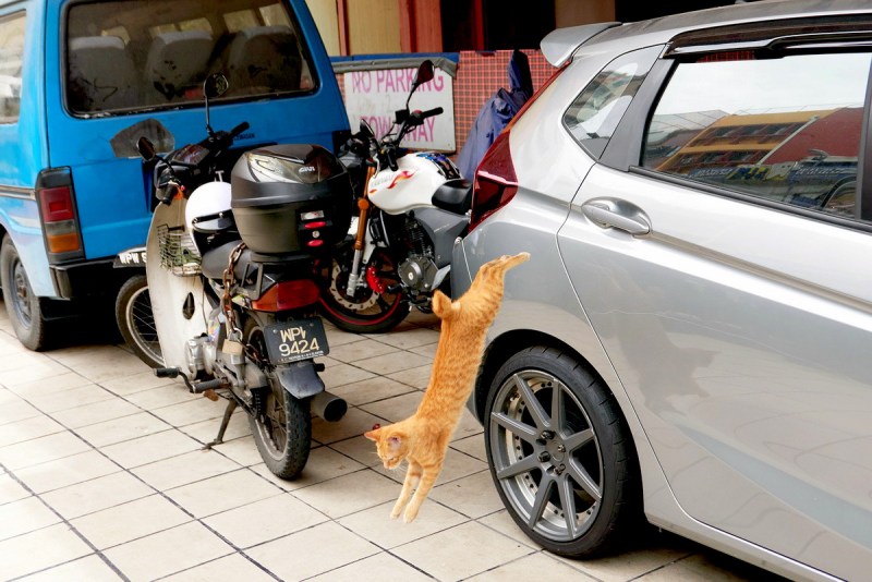 I have to credit my friend Shaun Nykvist for this little phrase, since we both thought of this during one of our shooting sessions together. It’s premised on that fact that street shooting requires patience and a lot of waiting for something to happen. How do you know, or rather how can you successfully predict all the moments that will be worth shooting? When someone enters a building, office or shop, you know they have to come out eventually. And if that person was making a delivery for example, it’s likely that they will be out soon. It could take a short few seconds or minutes at worst, but this could just be the drama you need in the photograph! In the opening photo of the man jumping out of the side of the van, I knew he had to exit somehow and prepared for the shot – the jump was a bonus. Since I had anticipated and prepared, I was able to capture the jump in mid-air, which lent the image the element of drama I wanted. Sometimes, you need to actively work the scene to illicit drama, but keep the final intent and message in mind, as it may not be suitable for a photojournalistic image. For example, take the image of the cat getting down from the car roof below. Prior to the shot, I spent some time petting the cat so that when I walked away, it would follow me. And as you can probably guess, I walked away from the car, and the cat moved to get closer to me and could only do so by jumping down from the roof. I was ready with camera ready in hand to shoot it at the right moment!