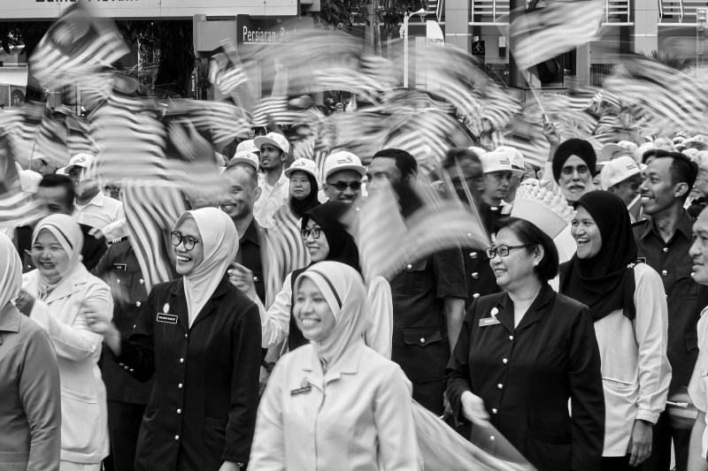 The National Day celebration for Malaysia takes a different tone this year following a recent and significant shift in the political landscape (as documented by MT here). I braved the insane traffic and impenetrable crowds to experience Malaysia’s 61st Independence Day celebration. Following two full days of back to back intensive wedding shoots, I was physically and mentally exhausted, but that did not deter my spirit to get up at an ungodly hour in the morning and be at Putrajaya (the celebration venue) in time to get close enough to the action. I did not have any particular story to tell or a pre-determined outcome for this series of photographs. When the celebration started I knew I was too mentally drained to command anything out of the ordinary so I decided to just go with the flow, enjoy the immense positive vibes alongside fellow Malaysians, shout the word “Merdeka” repeatedly at the top of my lungs and maybe, maybe be lucky enough to get some interesting snapshots.