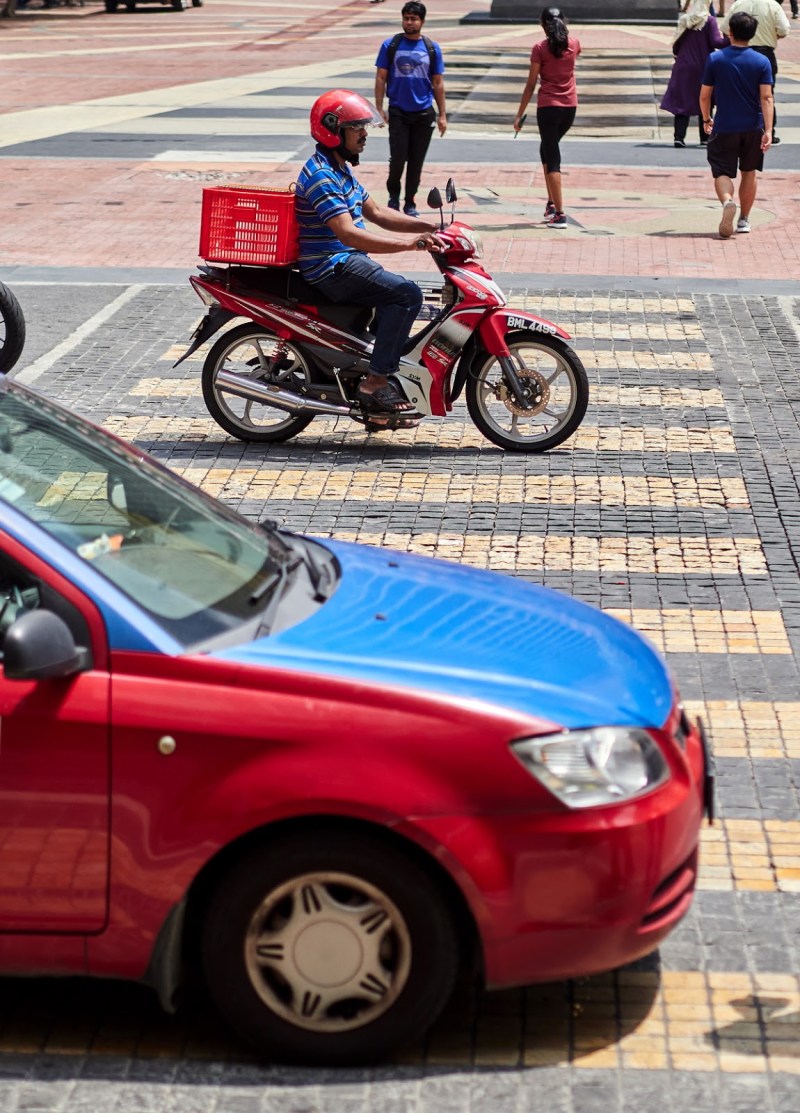 Why? Because Robin here managed to capture three types of “streetusers”, car, motorcycle driver and pedestrian with the same colours, red blue and black!