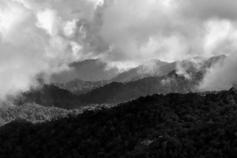 Recently I had a job that took me all the way up to Genting Highlands, which sit about 6000 feet above sea level. I was there over the weekend and most of my time was spent shooting for the job, leaving me no opportunity to roam around. Luckily, my hotel room overlooked the surrounding mountains. It was quite an experience staying in a place so high up that and close to the cloud cover. My view was constantly covered by thick mist but when there was a brief clearing, I quickly shot some images. Due to the mist and other atmospherics, I found that the colours were flat and dull resulting in me converting my images to monochrome and ensuring a more dramatic output.
