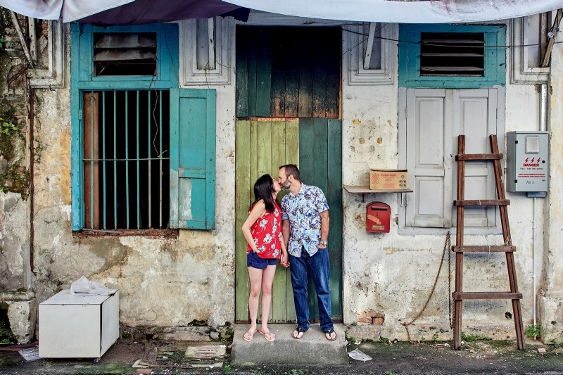 When Sarah, an old friend, shared news of her engagement and related visit to Kuala Lumpur, I could not help but ask if she was interested in a pre-wedding shoot here. I told her this would not be a typical engagement shoot at the park or by the beach. I wanted to do something unusual and different for Sarah by bringing her and Gregor, her fiancé, to my usual street shooting grounds and do their portraits there. Outdoor street-style pre-wedding is not new to me, I have done a few rounds with other clients but this was the first one I did around the Petaling Street area.